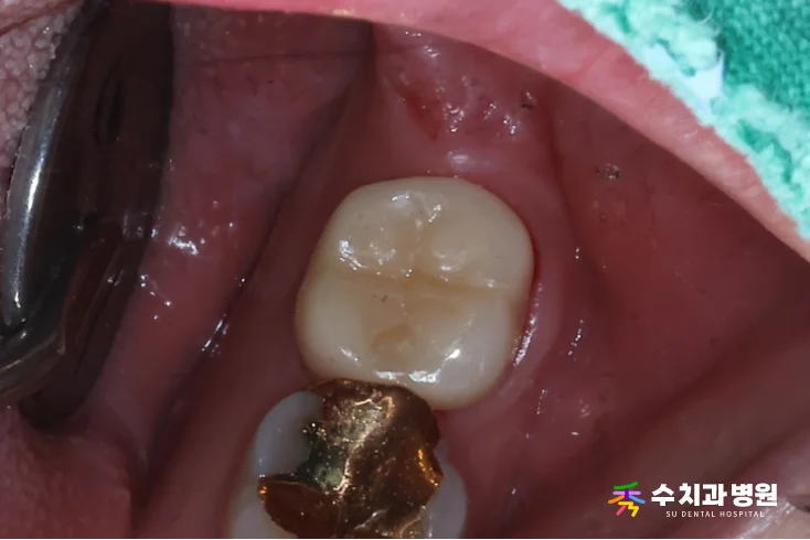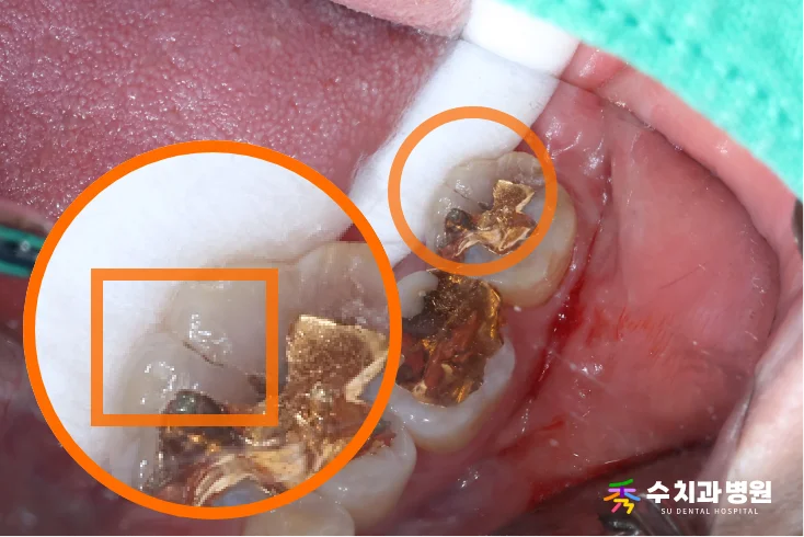 진단: 기존 골드인레이 하방 이차 충치 및 치아 균열(Crack)